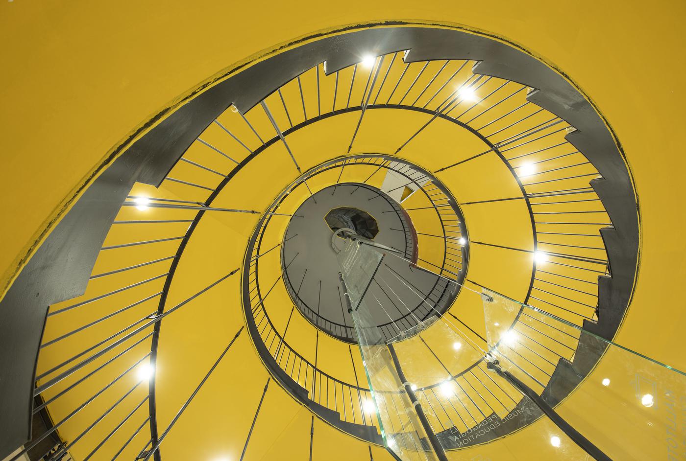 A három szintet egy 14 tonnás, függesztett, művészi csigalépcső köti össze az épület centrumában. A rugó formájú alsó csigalépcsőszakasz betonból készült, a zsaluszerkezetet a helyszínen, több hét alatt építették fel.