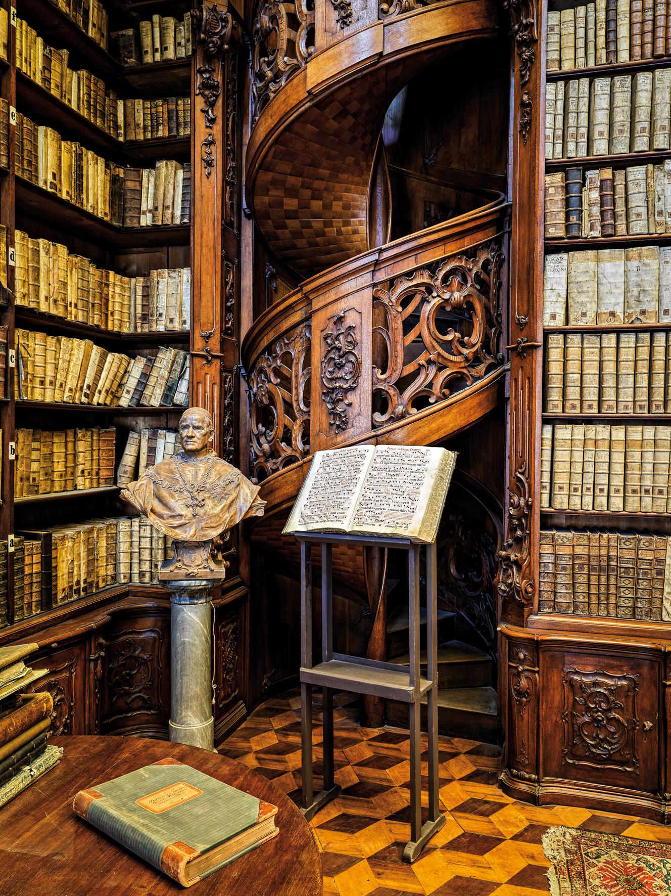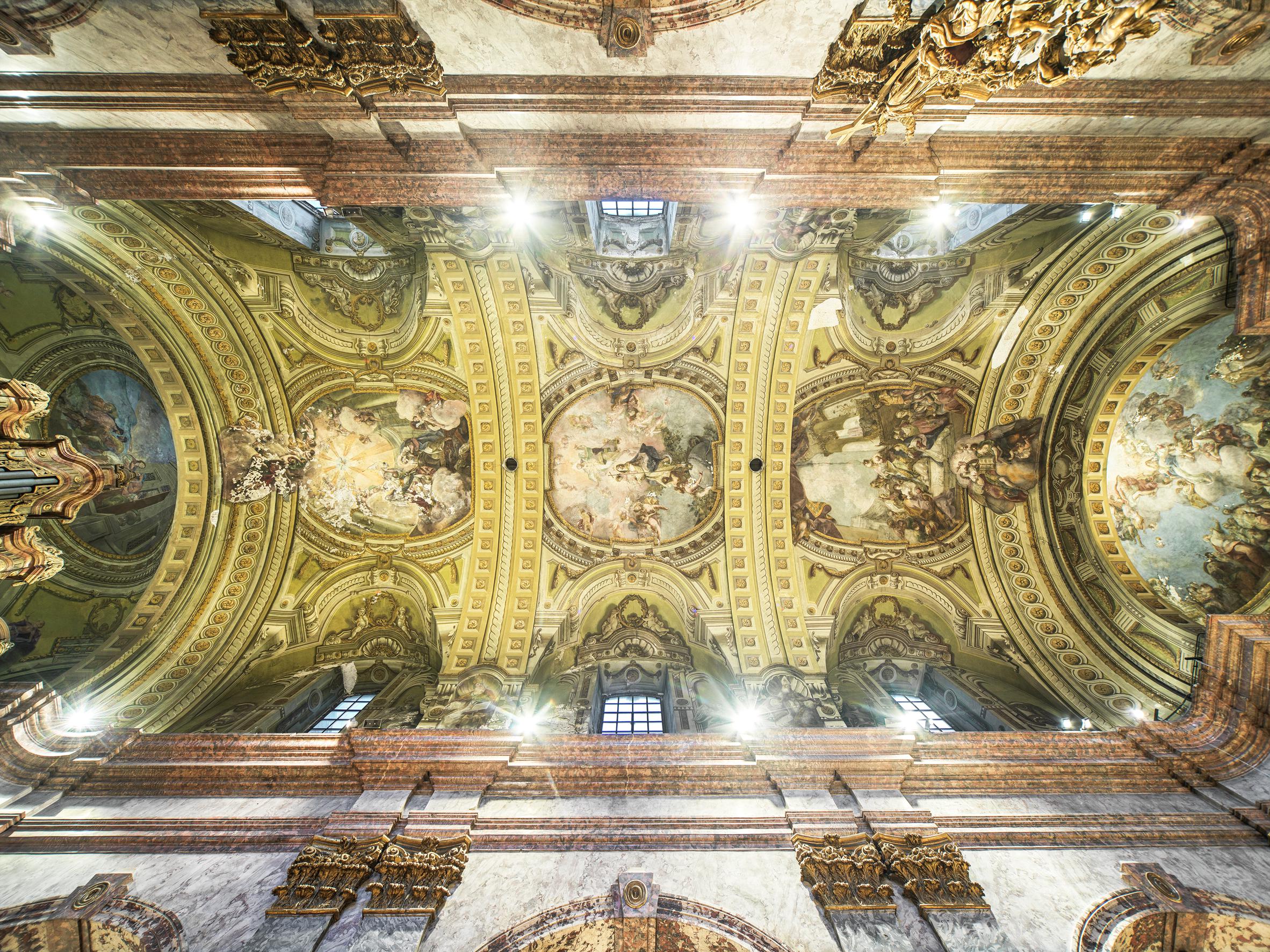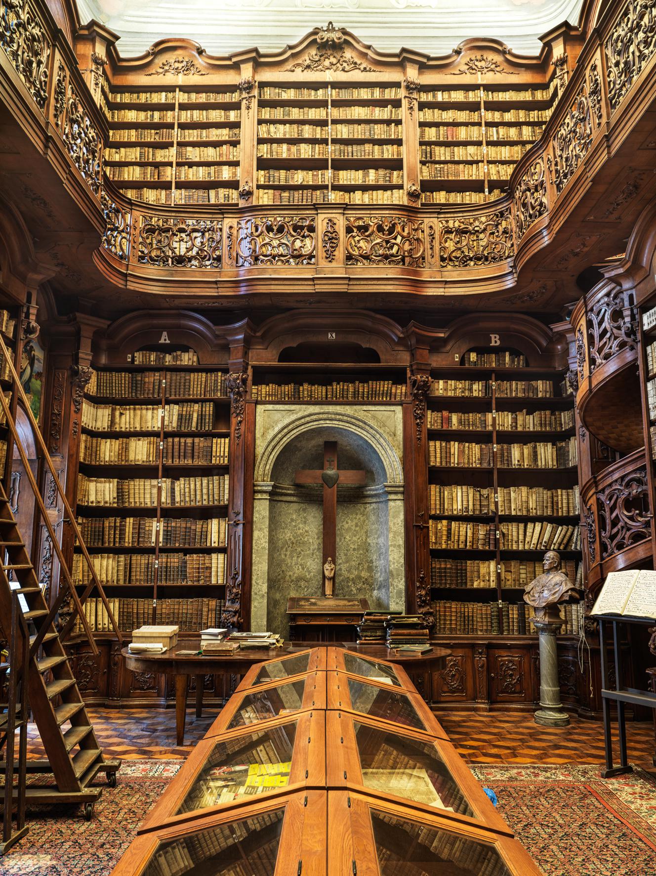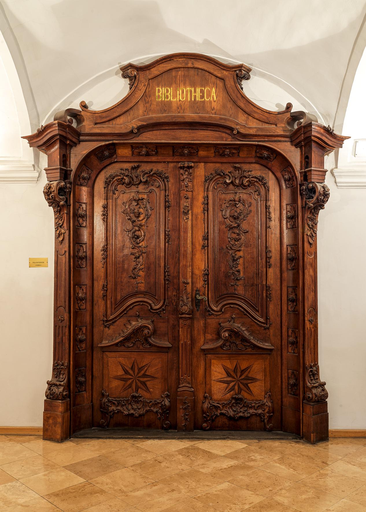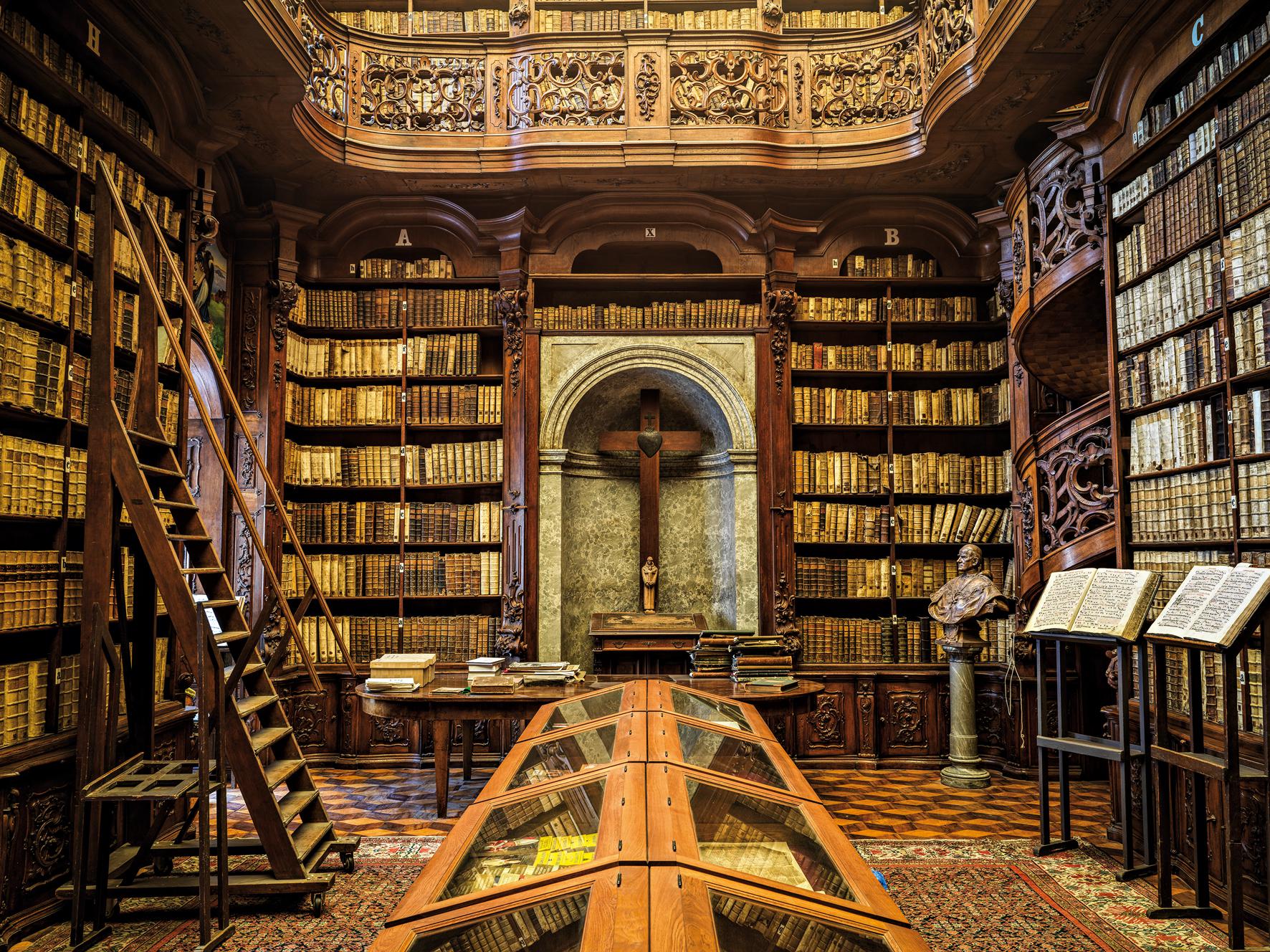 A könyvtár mennyezetének festményén a nőalakokként megjelenített természet- és humántudományok a világmindenség igazságát feltáró teológia előtt hódolnak.