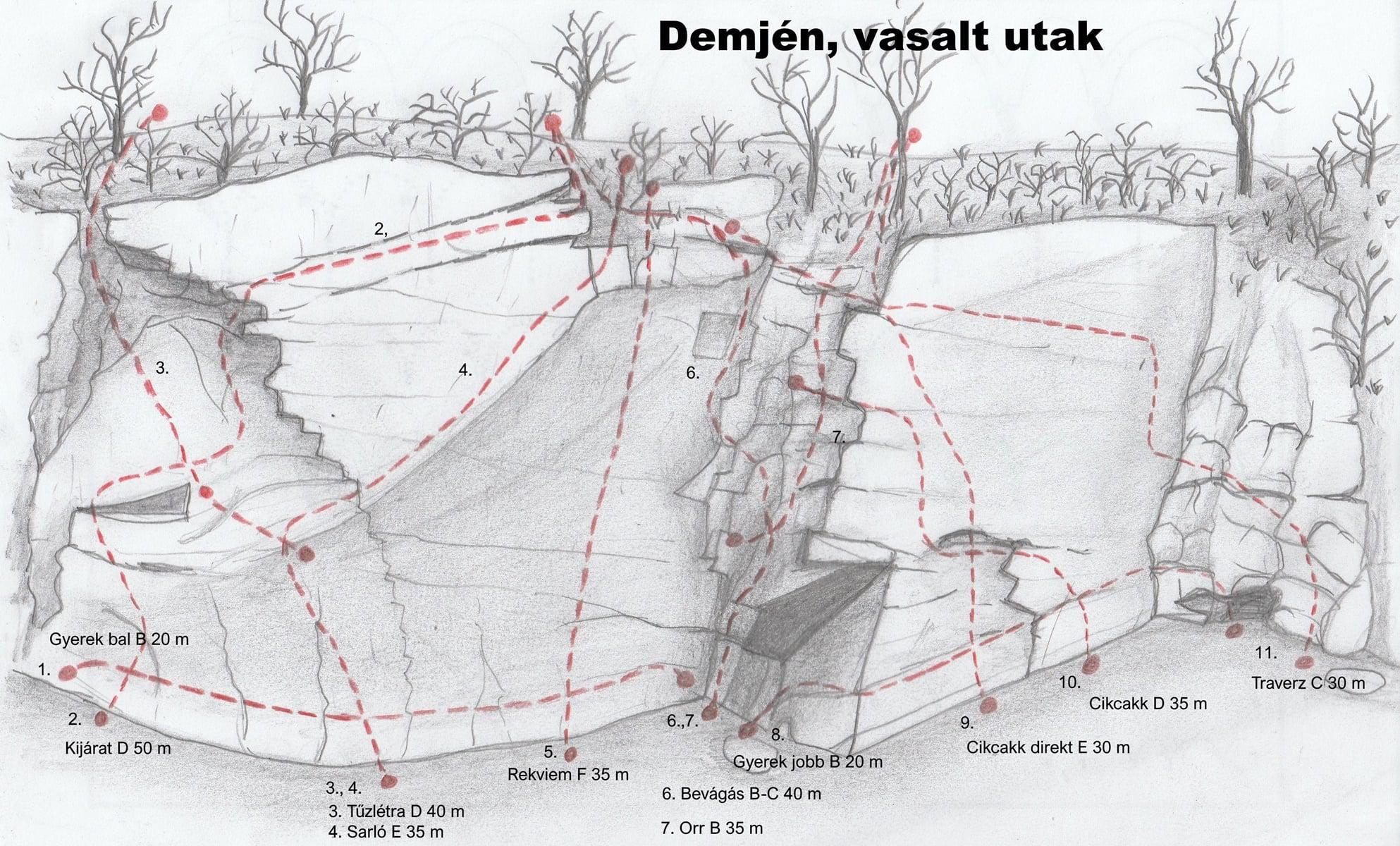 „A demjéni Via Ferrata pályákat a helyi önkormányzat tulajdonában lévő régi kőfejtőben alakították ki, melynek alkotó kőzete miocén kori vulkáni eredetű riolittufa.