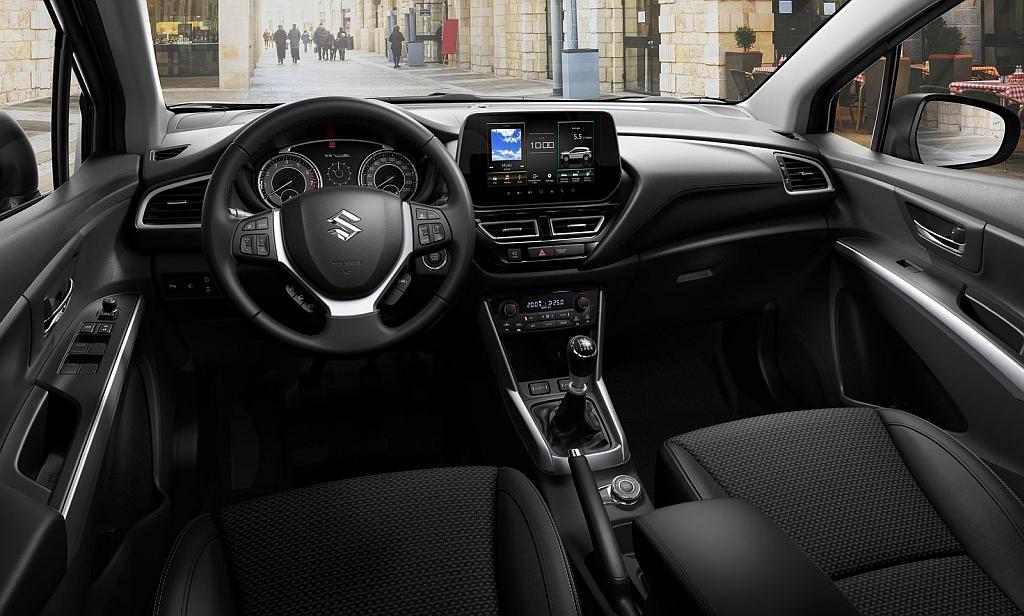 A beltér ugyancsak fiatalításon ment keresztül. A legszembetűnőbb változtatás az Apple és androidos készülékekkel is kompatibilis infotainment rendszert érintette, a kijelző helyet cserélt a középső légbefúvókkal, így a műszerfal tetejére került. Az kifutó modell szinte gyerekesnek ható grafikájával ellentétben az S-Cross kijelzője már megfelel a 21. század elvárásainak. Nem mondható villámgyorsnak, de felbontása és aprólékos kidolgozottsága kellemes meglepetést okozott. Különösen jól sikerült a kezdőoldal, amelyen gyakorlatilag minden olyan információ megjelenik, amelyre menet közben szükségünk lehet – egyszerre jeleníti meg a multimédiás rendszereket, a navigációt és a járművel kapcsolatos legfontosabb tudnivalókat. Így vezetés közben nem kell a menüpontok közt navigálnunk, ami egyrészt biztonsági szempontból fontos, másrészt pedig gyorsabban betöltődnek az oldalak. A kevesebb érintésnek köszönhetően ráadásul nem szükséges minden utazást követően megtisztítanunk a kijelzőt az ujjlenyomatoktól.