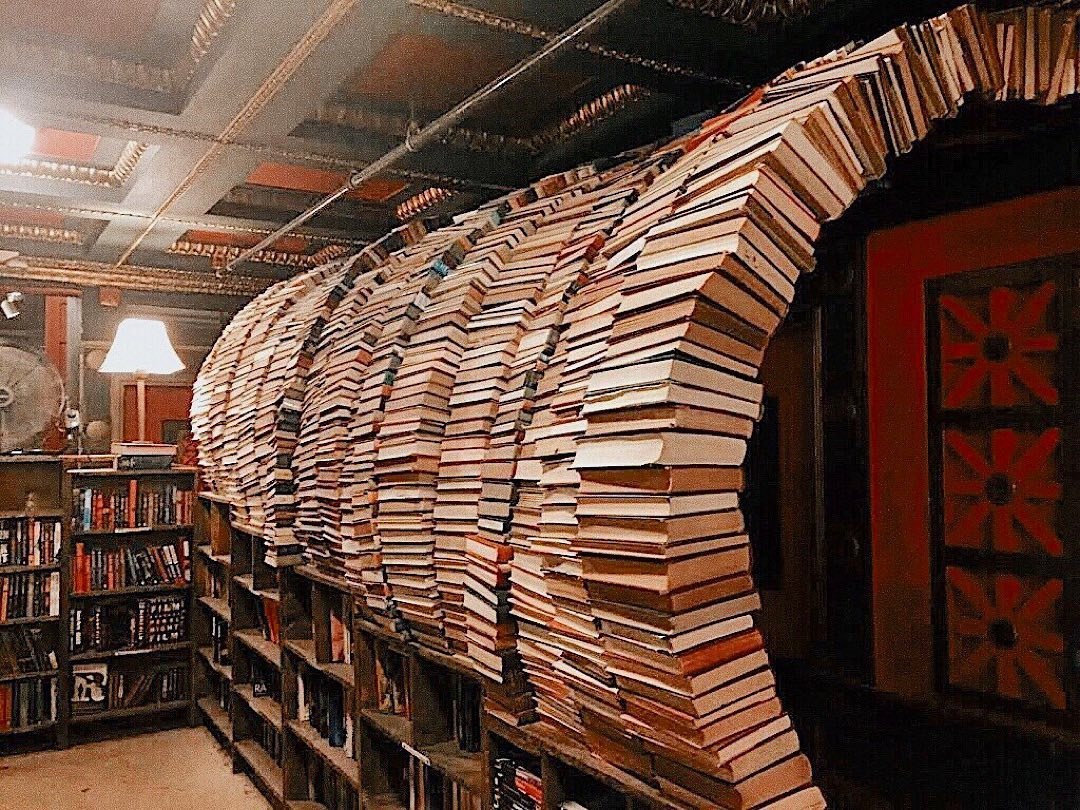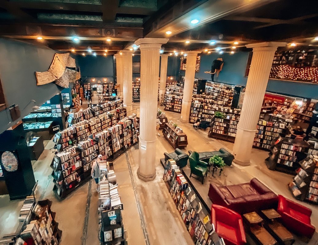 Az egykori banképületben lévő könyvüzletben az a szabály, hogy nincs szabály, a random elhelyezett könyvespolcok között órákig elnézelődhetünk.