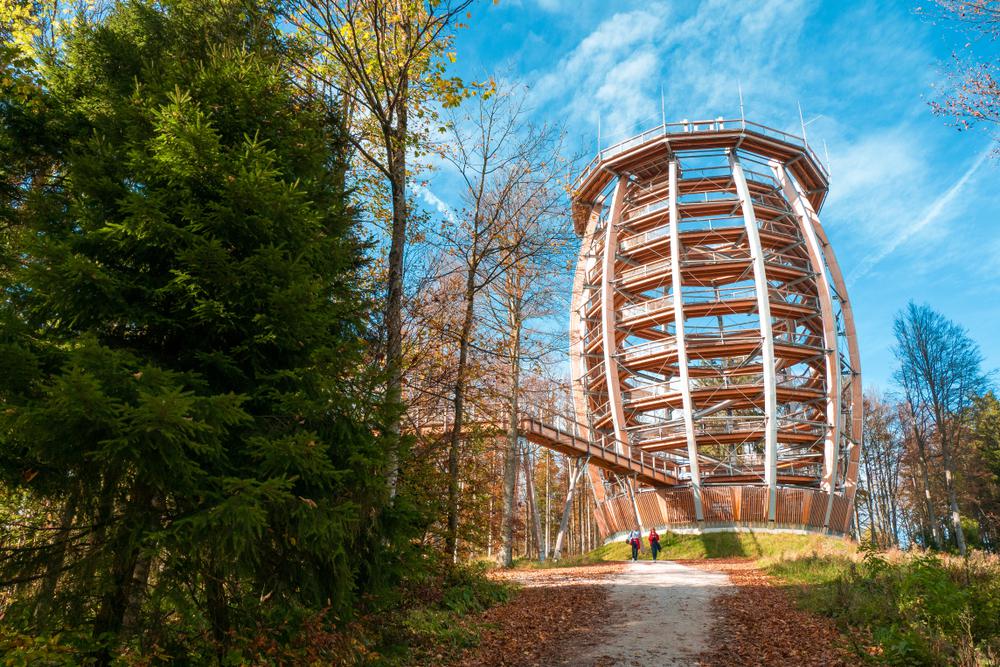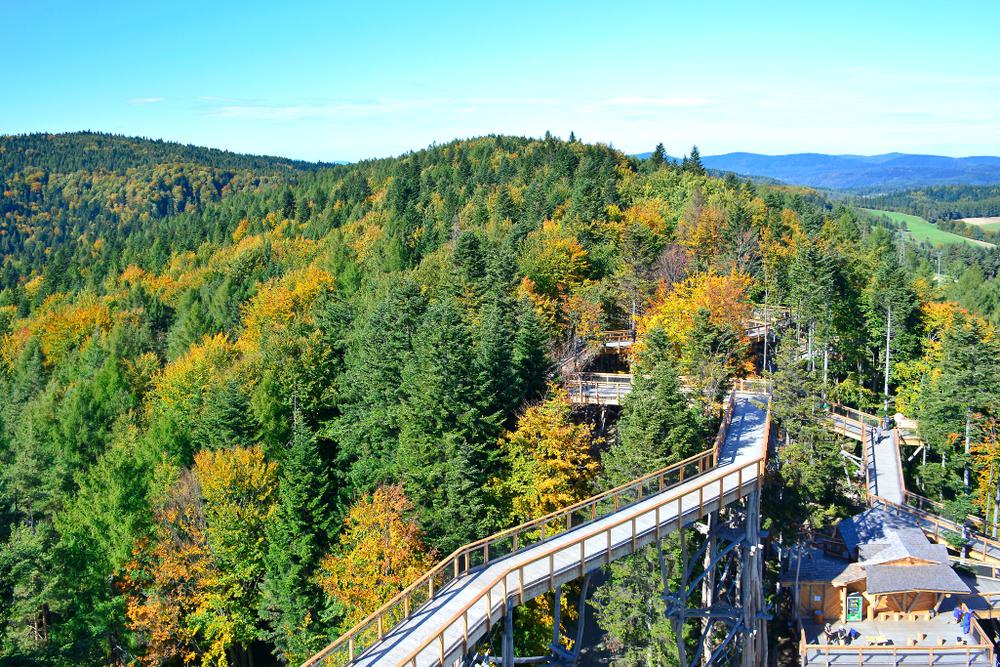 A világon az első lombkorona-tanösvényt 2009-ben Németországban nyitották meg a cseh határ közelében fekvő Neuschönau község mellett. Az 1300 méter hosszú ösvény egy 44 méter magas kilátóhoz vezet, ahonnan fantasztikus panoráma nyílik: északi irányban, a Lusen-csúcs felé a lakatlan erdei vadonra, délre a Bajor-erdő parkosított kultúrtájára, de a láthatáron az Alpok is feltűnnek. A fák között 8–25 méter magasan húzódó tanösvényen több információs pont is található, ahol séta közben kaphatunk érdekes tudnivalókat az erdő életéről.