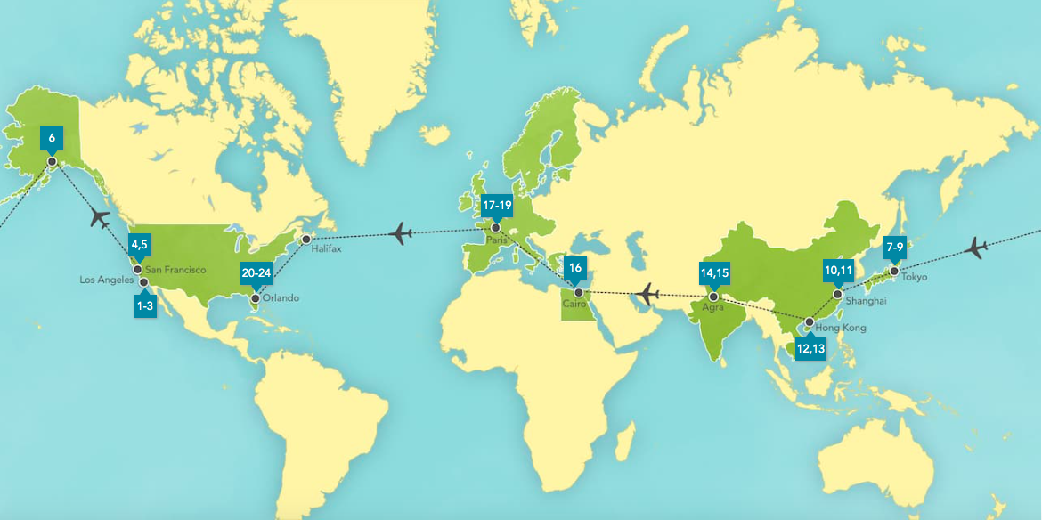 A repülőgép 2023. július 9-én száll fel, a 110 ezer dolláros utazás augusztus elsején ér véget. A landolásokat követően az ügyfeleket kisebb csoportokba osztva szállítják majd a luxus szálláshelyekre – mint például a híres kaliforniai Disney Skaywalker Ranch-re, az egyiptomi Marriott Mena House hotelban vagy az impozáns indiai Oberoi Amarvilas szállodába.