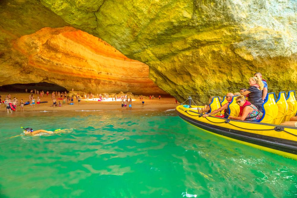 Lagost és Portimãót magunk mögött tudva szálljunk csónakba, hogy a tengeren ringva bejárjuk Algarve leghíresebb természeti képződményét, a Benagil partjainál található barlangokat. A másfél órás motorcsónaktúrán szemtanúi lehetünk a tenger ezeréves szobrászművének, ahogy a ritmikus ár-apály hullámai érdekes geológiai formákat alakítottak ki a térségben. Nemcsak különálló homokkő oszlopokat, hanem partfalba vájt barlangokat, sőt barlangon át megközelíthető strandokat is találunk itt. Ha pedig buzog bennünk az adrenalin, és inkább a magasból vennénk szemügyre a vidéket, Albufeirában 75 euróért másfél órás tandem siklóernyőzésben lehet részünk.