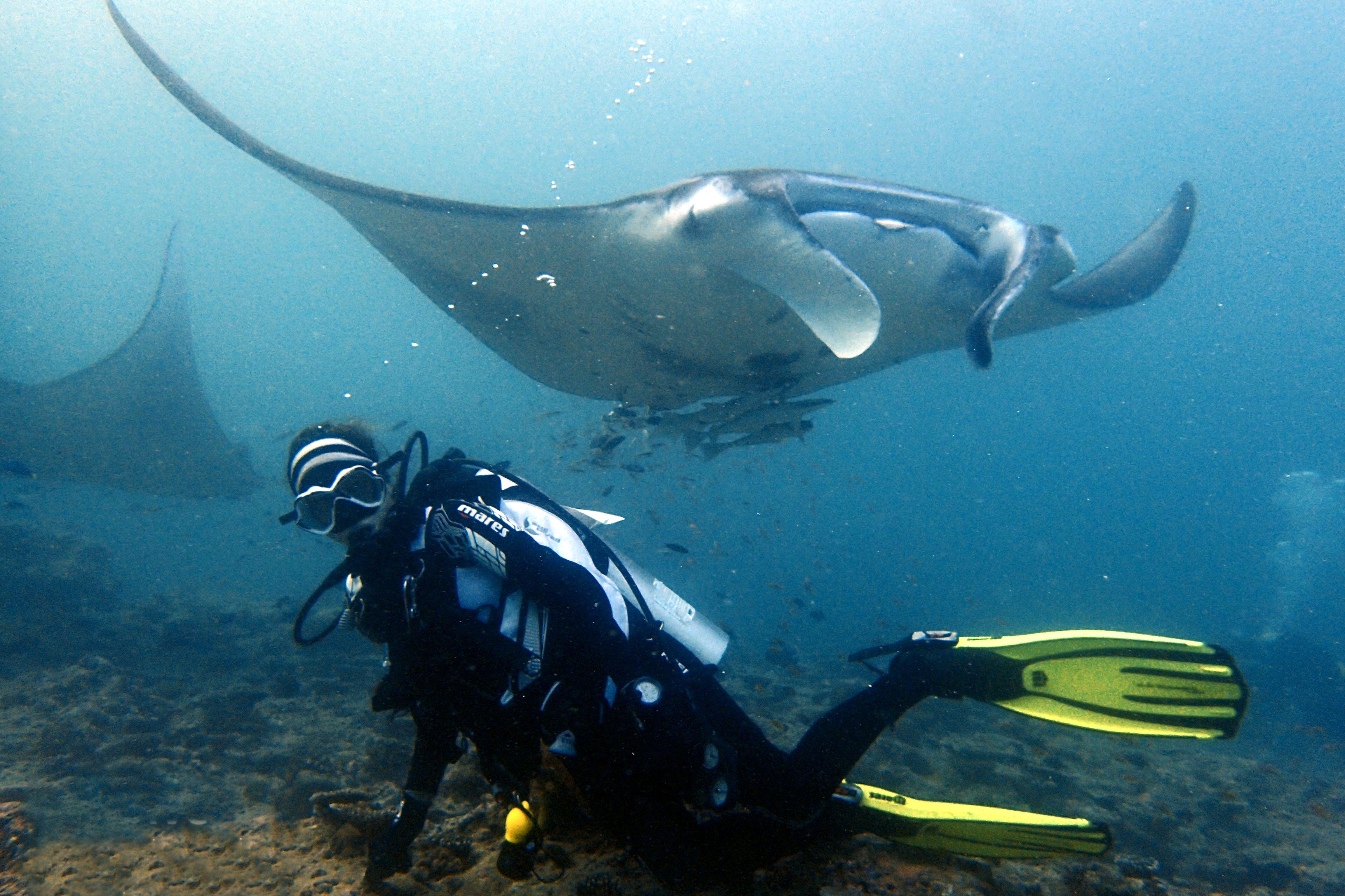 Az Indiai-óceán másik ikonikus lakója a manta, amely 5 méteres „szárnyaival" és kecses mozgásával igazi vízi balerinaként közlekedik a mélyben. Az egyik leghíresebb zátonyon, Moofushin történt, pontosan a 150. merülésemen, hogy belefutottunk egy jókora óriásrája-rajba. A manták nem zavartatták magukat, alig pár centivel felettem úsztak el, miközben komótosan elfogyasztották planktonokból álló ebédjüket. Ha tehát valaki a Maldív-szigetekre készül, ne hagyja ki az emlékezetes vízi balettet, a mantákat ugyanis snorkelezés közben is jól lehet látni a felszín közelében.