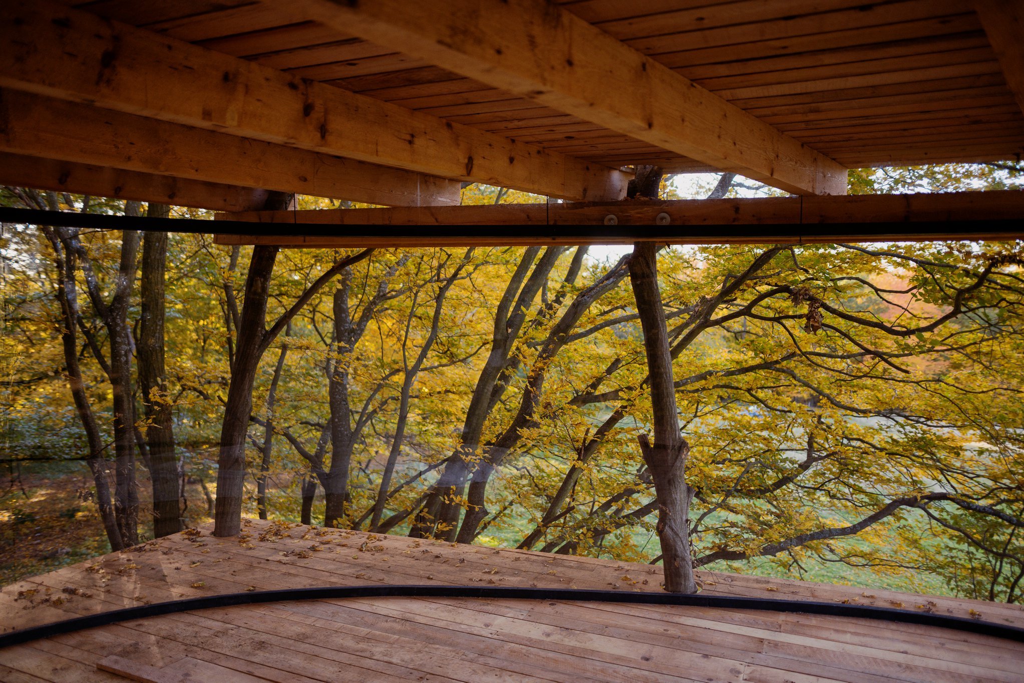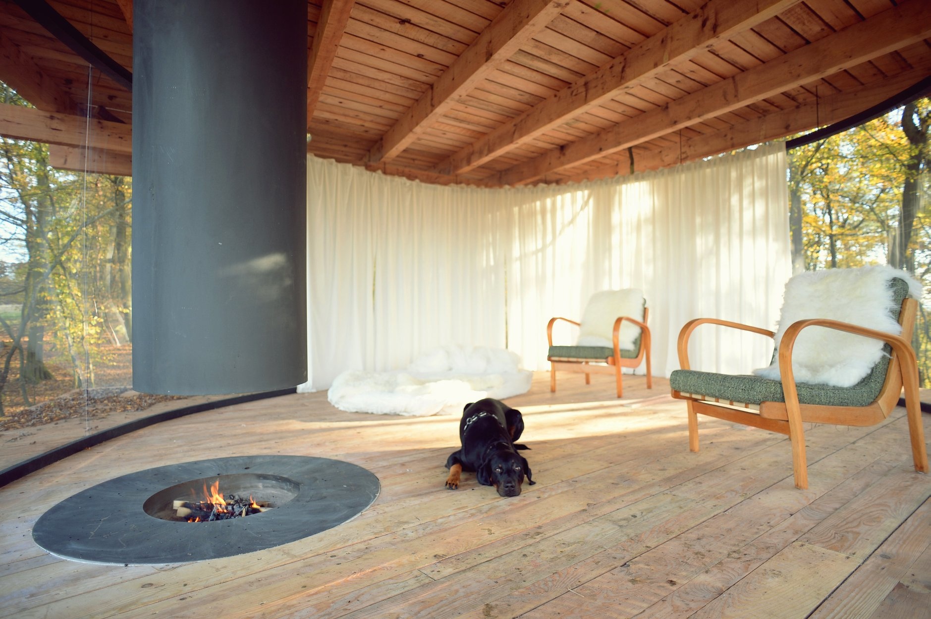 A tervező a szeparáltságot úgy oldotta meg, hogy a kunyhóba vezető létrát felhúzhatónak tervezte. 360 fokban, padlótól plafonig végig üvegablakon nézhetjük a tájat, persze ha még egy kis privát szférára vágyunk, akkor a körben sínen futó függönyt is behúzhatjuk. Hogyan szellőzik? Természetesen, hiszen a gerendáknál van körben egy 10 cm-es rés, ahol jár a levegő, plusz, ha a lépcsőt lenyitjuk, akkor alulról is árad be a friss levegő.