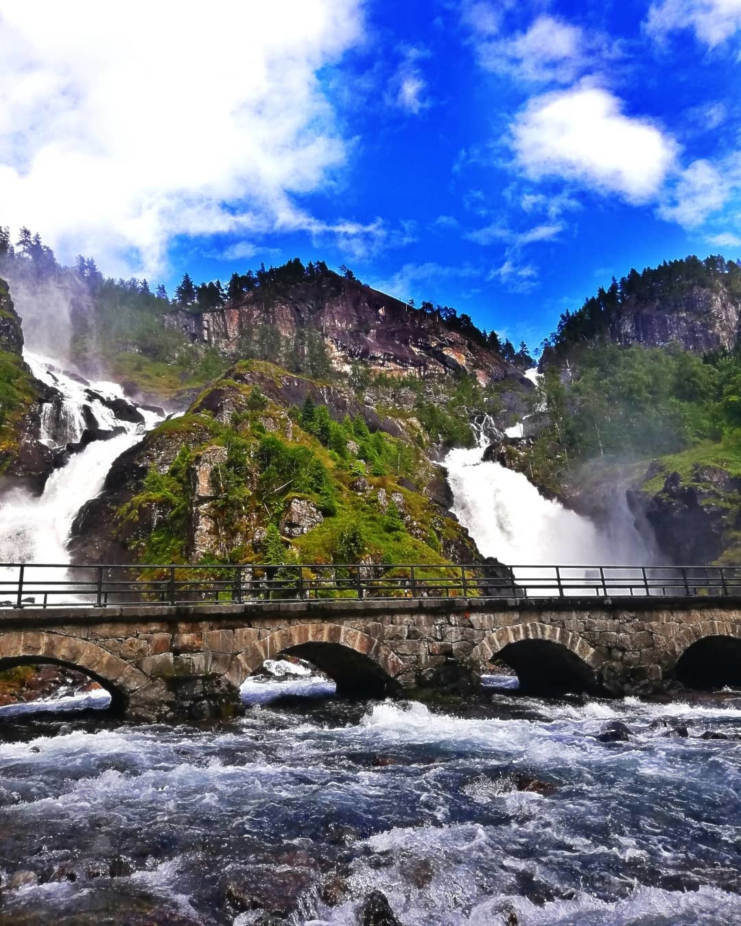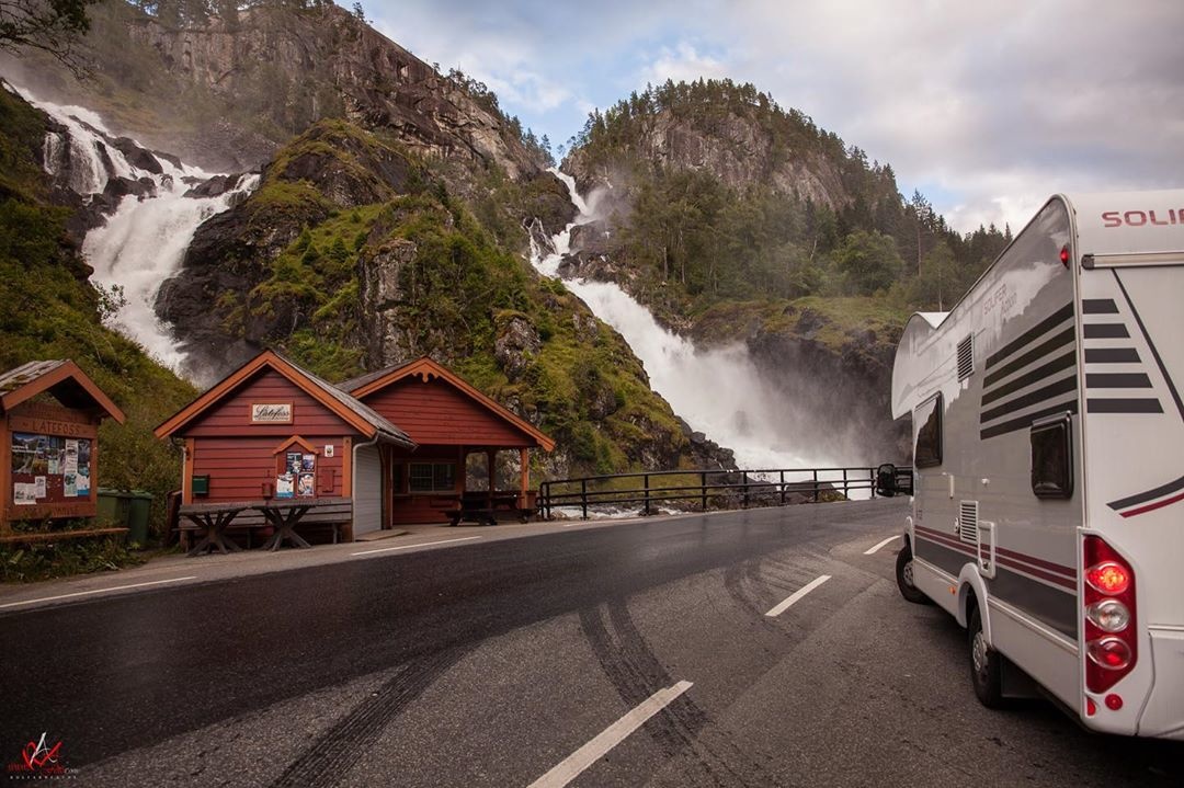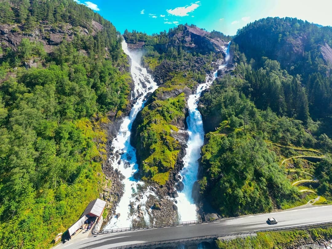 A másik nagyon kedvelt természeti látványosság Norvégiában a Låtefossen kettős vízesés, amely 163 méter magas. Olvadáskor, nagy vízhozamnál olyan nagy erővel hömpölyög lefelé a víz, hogy a mellette, illetve keresztül alatta futó úton elhaladó autókat ragyogóra mossa. Ez a környék egyébként kitűnő hegymászóterep is, szépen kiépült, hogy a túrázni vágyók ne csak a vízesést látogassák meg, hanem kirándulni is tudjanak egy jót a közelben.