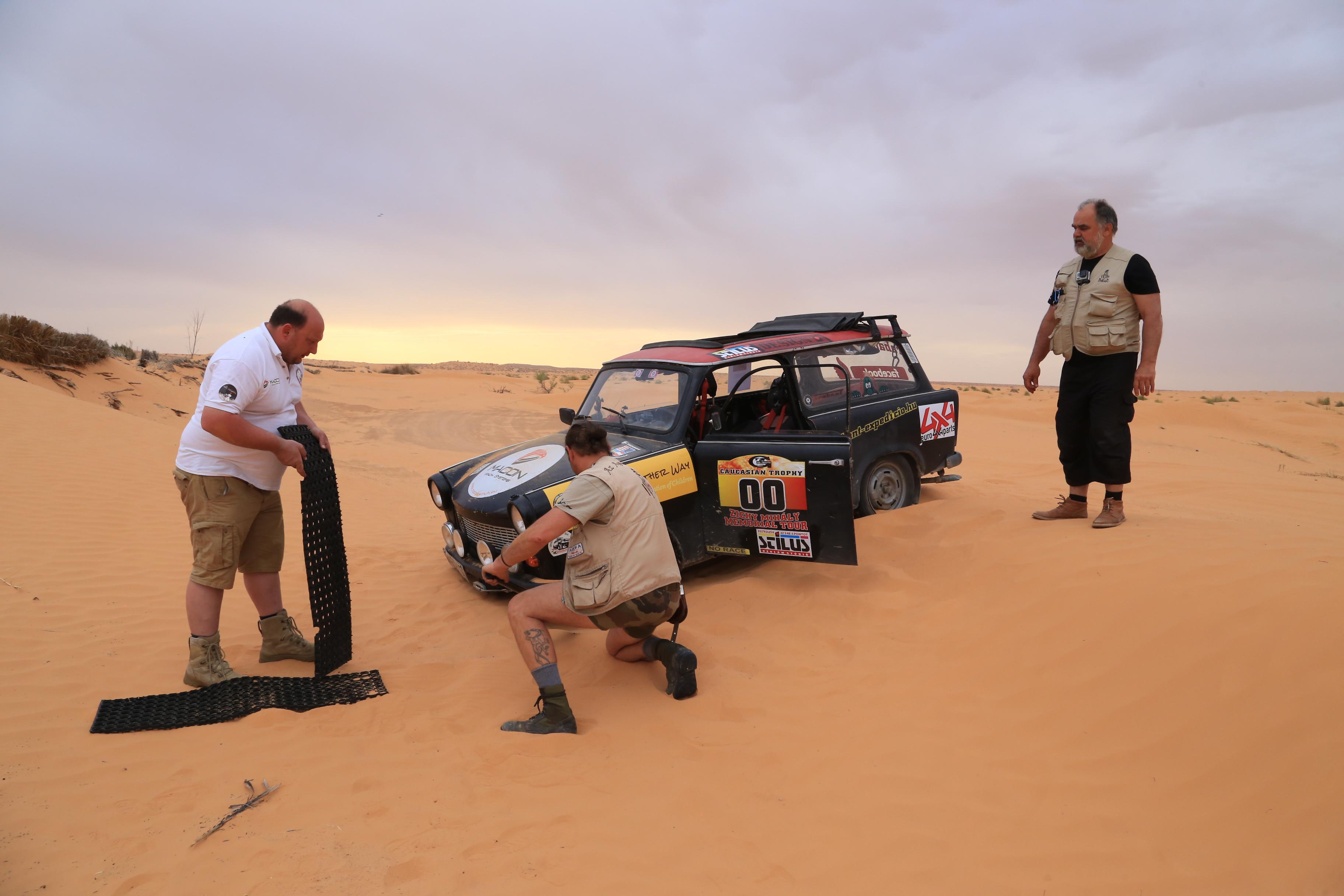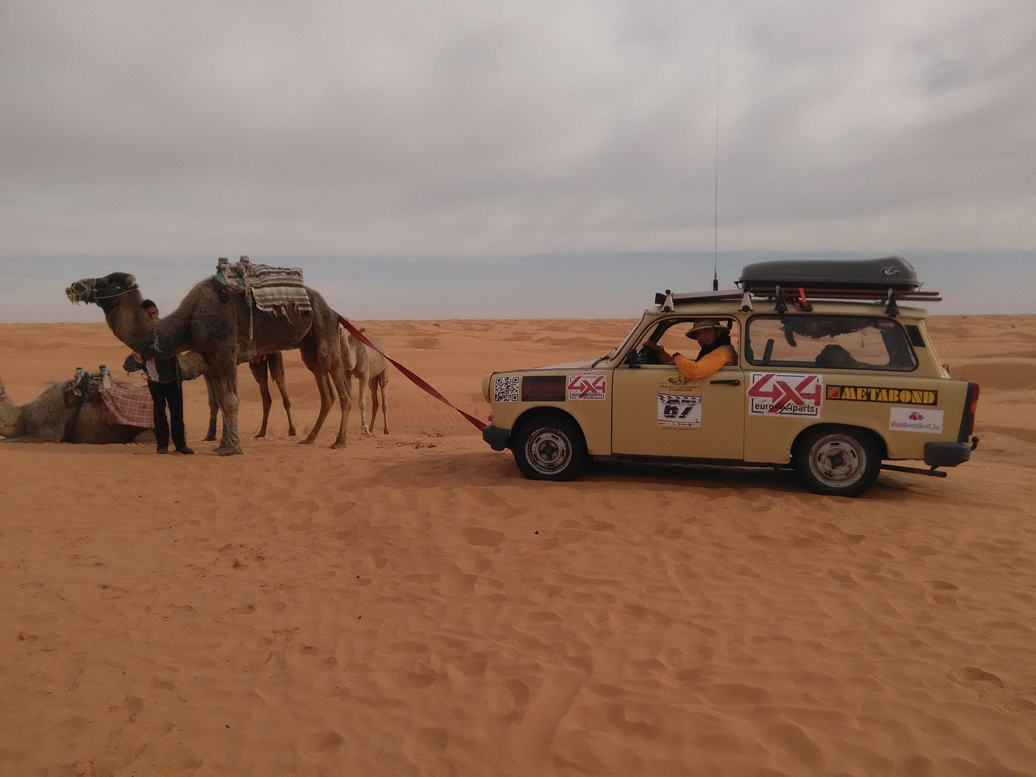 Tunéziába, Douzba szállítottunk hátrányos helyzetű iskolába adományt az Afrika Másként Alapítvány megbízásából. Nekik az a fő profiljuk, hogy szponzorokat keresnek tehetséges gyerekek taníttatására. Kaptunk egy nagyobb adománydobozt, amit szétosztva a két autóban elvittünk az iskolának. Voltak benne füzetek, papírok, logikai játékok, minden, ami csak befért a Trabantokba.